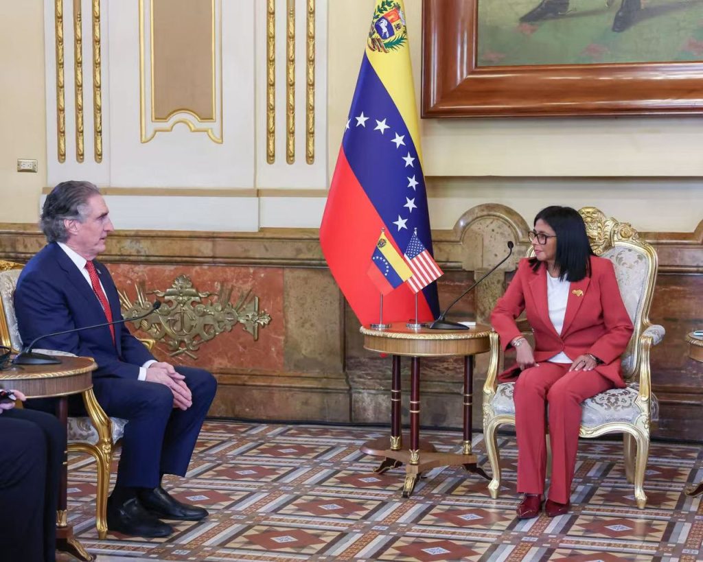 La presidenta encargada de la República, Delcy Rodríguez, conversó sobre el flujo de inversiones para la nación venezolana y el ingreso de nuevas tecnologías para desarrollar el sector minero, en conjunto con el secretario del Interior de Estados Unidos (EE. UU.), Doug Burgum.